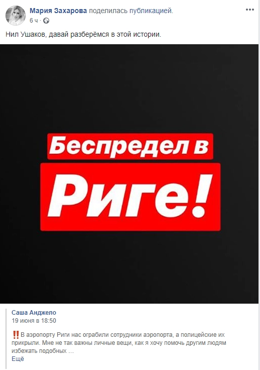 Мария Захарова на своей странице в Facebook попросила Ушакова обратить внимание на этот случай.