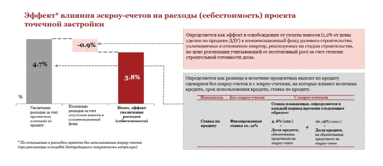 Она привела данные специального исследования компании PriceWaterhouseCoopers. Из него следует, что в районах массовой застройки жилье при новой схеме подорожает на 3%, а в точечных проектах — на 3,8%. Это соразмерно инфляционному приросту. Зато существенно снизятся риски недостроя.