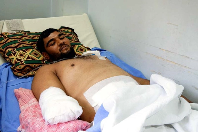 Раненый при минометном обстреле палестинец. Мужчина потерял не только руку и ногу, но и маленького сына, сидевшего рядом с ним на улице в момент обстрела.
