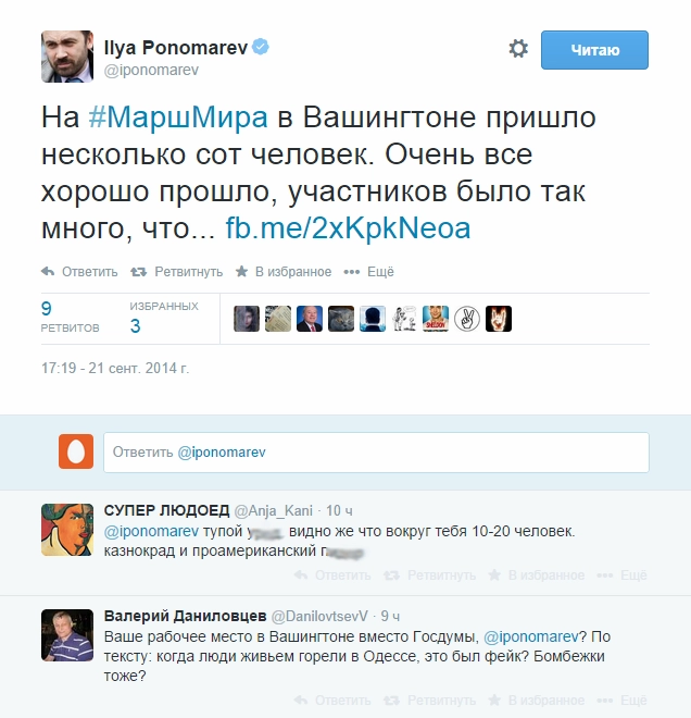 Стоит отметить, потрудился Пономарев на славу — вашингтонский «Марш мира» прошел в полном соответствии со своим старшим братом, состоявшимся в столице России: на месте и украинские флаги, и невнятные лозунги. Попытка существенно приукрасить масштаб акции также присутствует: как и Борис Немцов сотоварищи в Москве, соревнующиеся в преувеличении марширующих, Пономарев ловко превратил пару десятков собравшихся в Вашингтоне эмигрантов в «несколько сот человек».