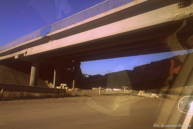 На обратном пути в Донецк таксист пробует другую дорогу. В сумерках свистим тормозами. Чуть не скатываемся с обвалившегося моста. Выходим осмотреться, вокруг темнеют несколько миномётных дырок. Сам мост над железнодорожными путями скорее всего подорван специально. Разворачиваемся.