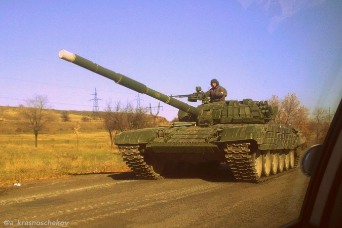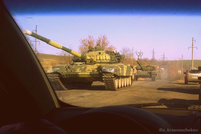 Внезапно понимаем, что нужно прижаться к обочине. По встречке с грохотом движется танковая колонна. Не менее десяти машин. Снимаю прямо из салона и уже предчувствую резонанс в твиттере, видя российский флаг на одном из танков. Какое поле для манипуляций массовым сознанием! Фотки можно легко представить колонной, движущейся от российской границы, можно снабдить гео-тэгом и придать фотоснимку ещё какую-нибудь «сенсационность». Впрочем, как ни подпиши — отпущенное в твиттер почти сразу начинает жить своей жизнью. Только вот не все из читателей светящихся лент догадываются, что желающие séparer от Украины (а яснее — сепаратисты) катаются здесь на бронетехнике под российскими знамёнами с концовки апреля. Да и бронетехнику в разном состоянии можно отыскать во многих фронтовых селениях: хоть каждый час «сенсации» выпускай.