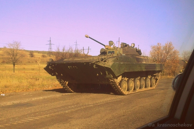 По пути солнышко, но иногда совершенно жуткие картины. Вот сельский поворот, и весь десяток домов на нём выжжен до кирпичного основания. На другой стороне чернеют расплавившиеся торговые киоски. Не можем останавливаться здесь для съёмки, торопимся. Едем мы за Луганск, к селу Смелое. Там более двух недель держалась в окружении часть бригады украинских десантников. Вечером предыдущего дня, 27 октября, после ультиматума командования ЛНР они покинули позицию, часть техники оставив, другую взяв с собой. Ситуация оставалась неясной. Но как рассказал нам позже зам. министра обороны с позывным «Коммунист»: вёл колонну от поста он сам, в первом БТР. Благодарил командующего с украинской стороны за понимание, за «поступок». Назвал войну братоубийственной и отметил, что лишней крови луганским бойцам не хочется. Я смотрел на его кожаную фуражку с красной звездой, на глаза и чувствовал, как твёрд, но как устал этот человек.
