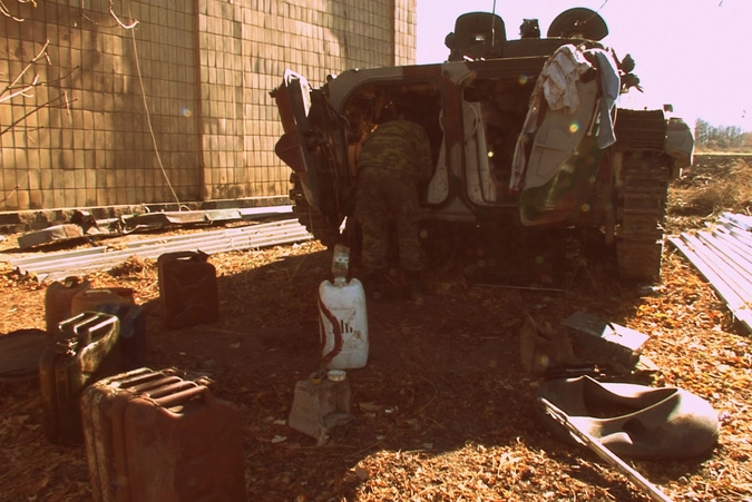 Несколько единиц неповреждённой снарядами, но весьма потрёпанной в целом лёгкой бронетехники, он называет «целиком отжатой у украинцев». Показывает на замазанные белые полосы.