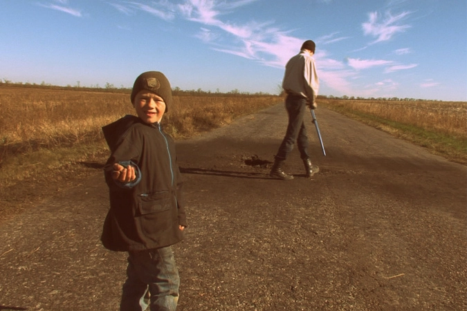 Неподалёку на дороге бродит мальчик лет девяти и с ним парень лет четырнадцати, с нарушением речи. Показывает дырку от мины в дороге, раскрывает ладонь с большим осколком. Спрашиваем маленького: