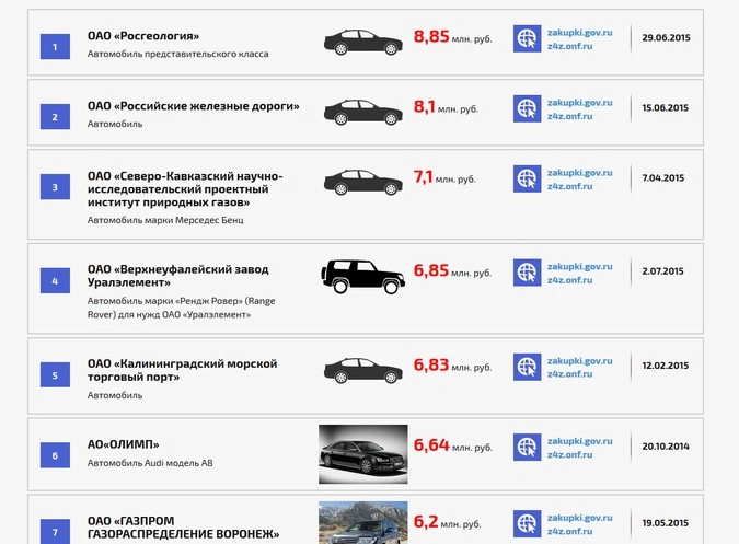 Самой расточительной закупкой автомобилей по итогам анализа стало приобретение ОАО «Росгеология» автомобиля представительского класса за 8,85 млн руб. Второе место за ОАО «РЖД» с автомобилем за 8,1 млн руб. На третьем месте ОАО Верхнеуфалейский завод «Уралэлемент», указавший конкретную марку – Range Rover.