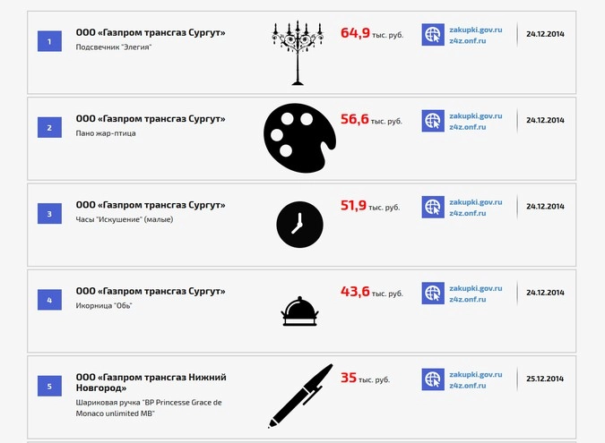 В закупке сувениров, забрав все 4 первых места отличилось ООО «Газпром трансгаз Сургут». В качестве сувениров данной компании потребовались: подсвечник «Эллегия» за 64,9 тыс руб., пано «Жар-птица» за 56,6 тыс. руб., часы «Искушение» (малые) за 51,9 тыс. руб. и икорница «Обь» за 43,1 тыс. руб.