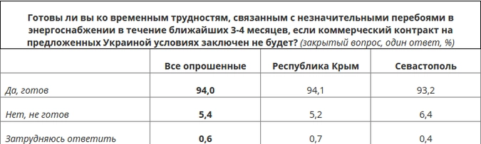 Кроме того, социологи поинтересовались у крымчан, готовы ли они ко временным трудностям, связанным с незначительными перебоями энергоснабжения в течение ближайших 3−4 месяцев. Отвечая на этот вопрос, респонденты из Крыма и Севастополя проявили не меньшее единство: 94% опрошенных выразили готовность к временным трудностям.