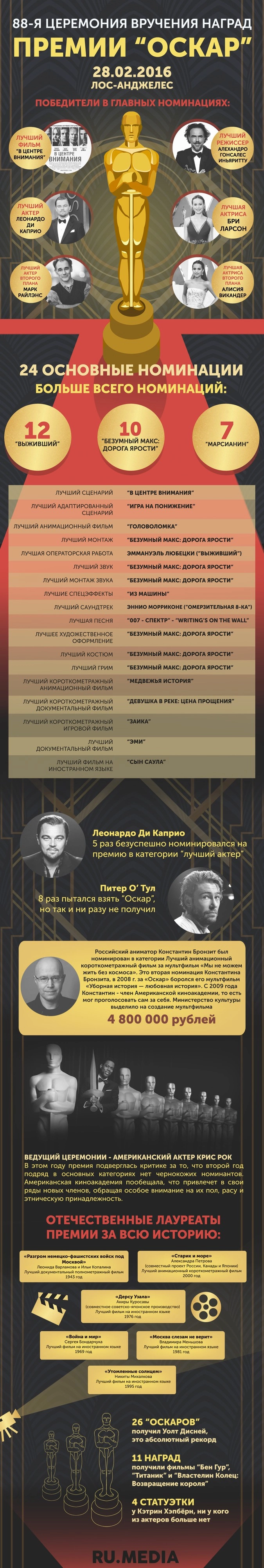 Предопределена была и победа Леонардо Ди Каприо, ожидание которой год от года так волновало всю мировую общественность: страшно даже представить, что случилось бы, если б Американская киноакадемия и на этот раз проигнорировала всеобщего любимца. Про «восстание дикапристов» не пошутил только ленивый, однако следует лишний раз подчеркнуть, что актер получил свою долгожданную статуэтку и по праву, и в сильнейшей конкуренции. Майкл Фассбендер («Стив Джобс»), Мэтт Дэймон («Марсианин»), и Брайан Крэнстон («Трамбо») определенно сыграли лучшие на данный момент свои роли, а прошлогодний лауреат Эдди Рэдмейн («Девушка из Дании») вновь продемонстрировал, как далеко он способен зайти в создании чрезвычайно неординарного образа. Все они проявили себя на высшем уровне, но величайший актер своего поколения сыграл (или прожил) в «Выжившем» ту роль, что полностью попала под неписаные «правила» Академии — и уже потому все его блистательные и не менее отважные конкуренты вынуждены были освободить ему дорогу, уступив дорогую награду.