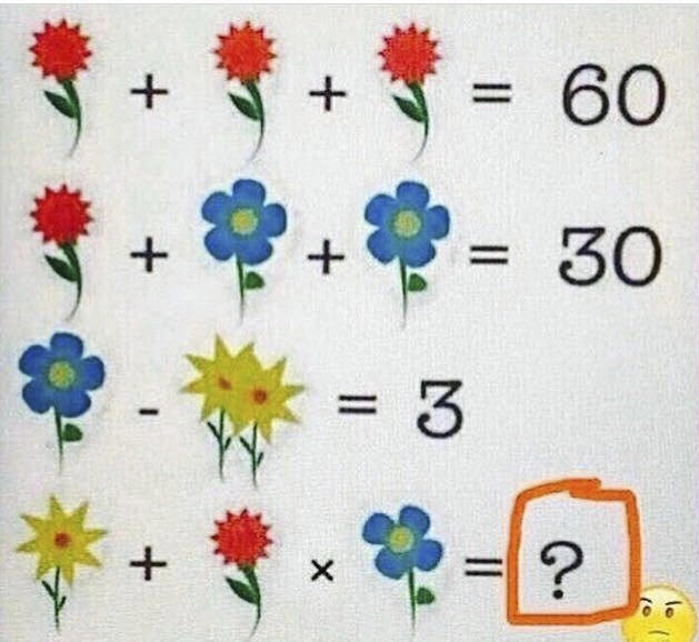 Тем не менее дебаты по поводу правильного ответа продолжались. Среди пользователей, столкнувшихся с непростой задачкой, нашелся даже учитель математики, гроза головоломок по имени Даг. Он заявил, что задача нерешаемая из-за разного количества лепестков у синего цветка. «Правильный ответ на этот вопрос: нет, я не могу решить это. Если вы придумали числовое значение, то вы ошиблись, к сожалению. Мы не имеем никакой информации для определения значения синего цветка с четырьмя лепестками», — написал он на своей страничке.