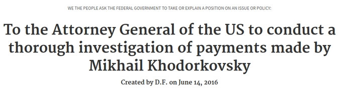 Авторы и подписанты петиции требуют от Генпрокурора США провести тщательное расследование платежей Ходорковского, который, возможно, является главным «спонсором» принятого Конгрессом США так называемого «Акта Магнитского».