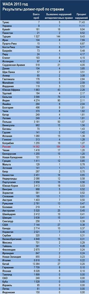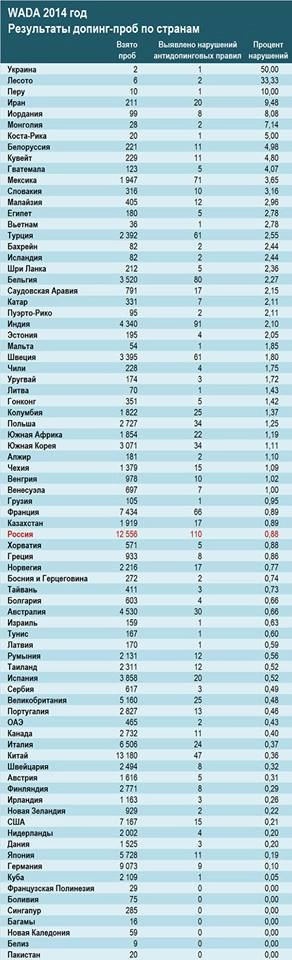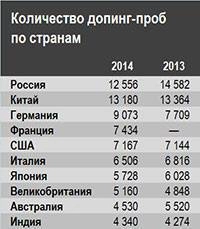 А пока посмотрим статистику WADA. Первое, что бросается в глаза, — антирейтинг стран по количеству выявленных антидопинговых нарушений, в котором мы занимаем первое место. Почти уверен, что с этой статистикой наши партнеры, которые устроили истерику в прессе и добились отстранения наших легкоатлетов от участия в Олимпийских играх, прежде чем начать атаку, внимательно ознакомились. Они знали, куда бить. Мы, к сожалению, отстаем, хотя все лежит в открытом доступе.