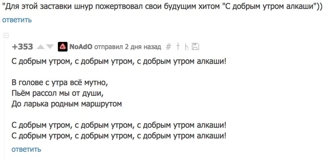 Некоторое сетевое творчество, порожденное бурным обсуждением заставки «С добрым утром, малыши!», в равной степени уморительно и нецензурно.