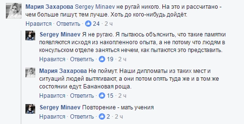 Его пост прокомментировала официальный представитель МИД РФ Мария Захарова, призвав Минаева никого не ругать: «На это и рассчитано — чем больше пишут, тем лучше. Хоть до кого-нибудь дойдёт», — пояснила она.