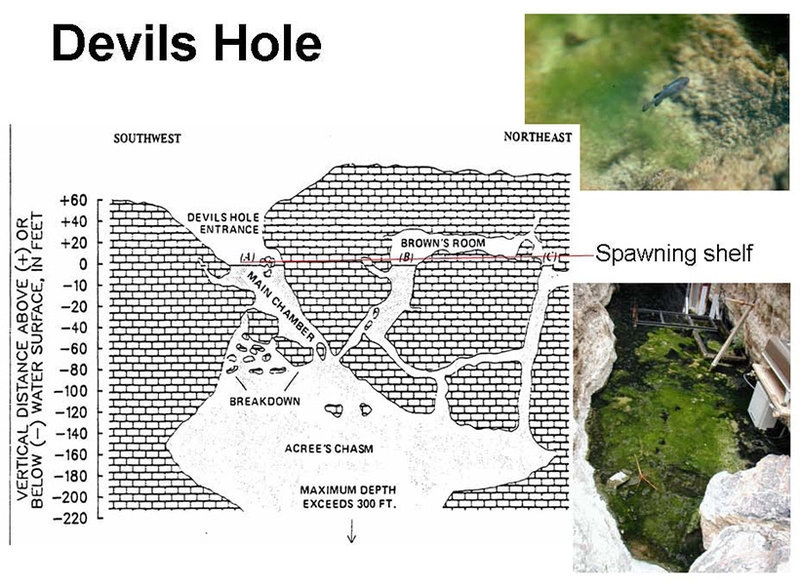 Напомним, что Яма дьявола (Devil's Hole) — это карстовая пещера на юго-западе США. Она частично заполнена водой, поэтому войти в пещеру затруднительно. Расщелина, через которую можно попасть внутрь Ямы дьявола, имеет размеры 5×1 метр.