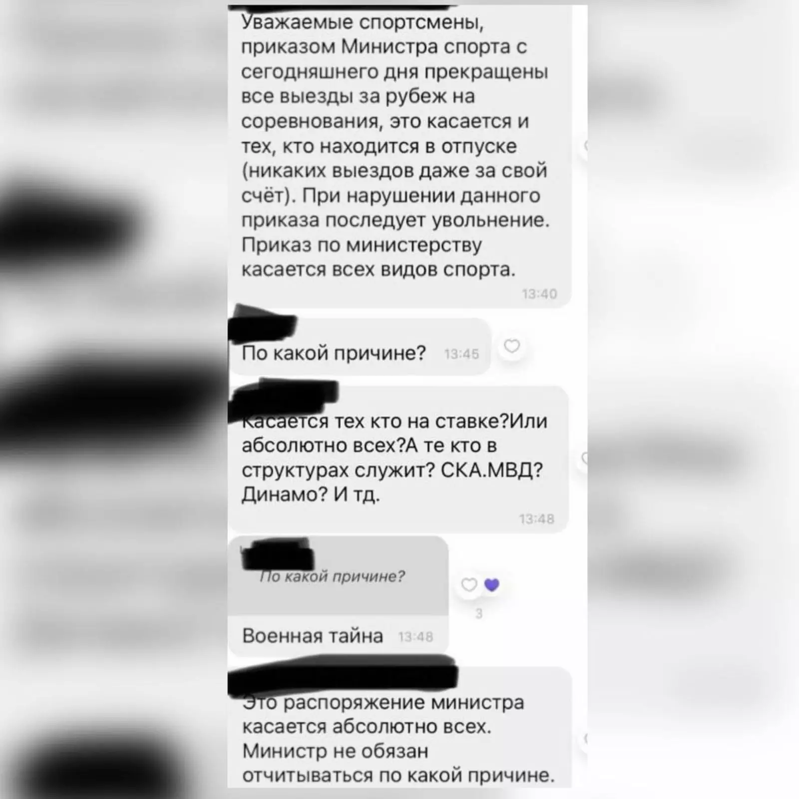 Кристина Тимановская считает, что официального документа о запрете от Минспорта нет. По ее словам, спортсмены страны никогда не видели официальных бумаг о тех или иных запретах. «Нам просто на словах говорили, что нам нельзя на сборы, на соревнования», заявила она РБК.
