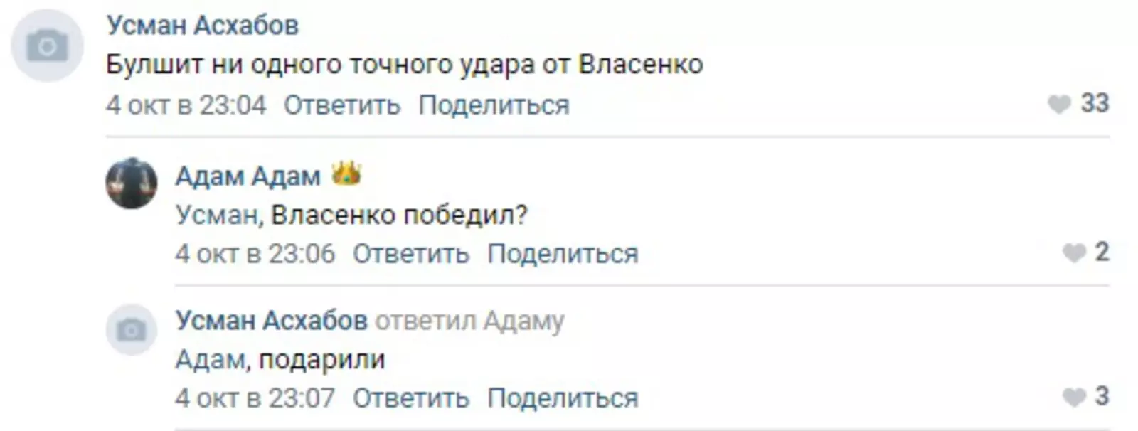 Власенко отметил, что проведенным боем с Халиевым «в целом доволен, но не на 100%». Впрочем, многие комментаторы в соцсетях отнеслись к финалу схватки в Грозном куда жестче, считая, что выходка болельщиков Халиева и «Ахмата» была как минимум некрасивой. Звучат даже утверждения, что после поединка началась массовая драка, которую якобы вынужден был разнимать лично Рамзан Кадыров.