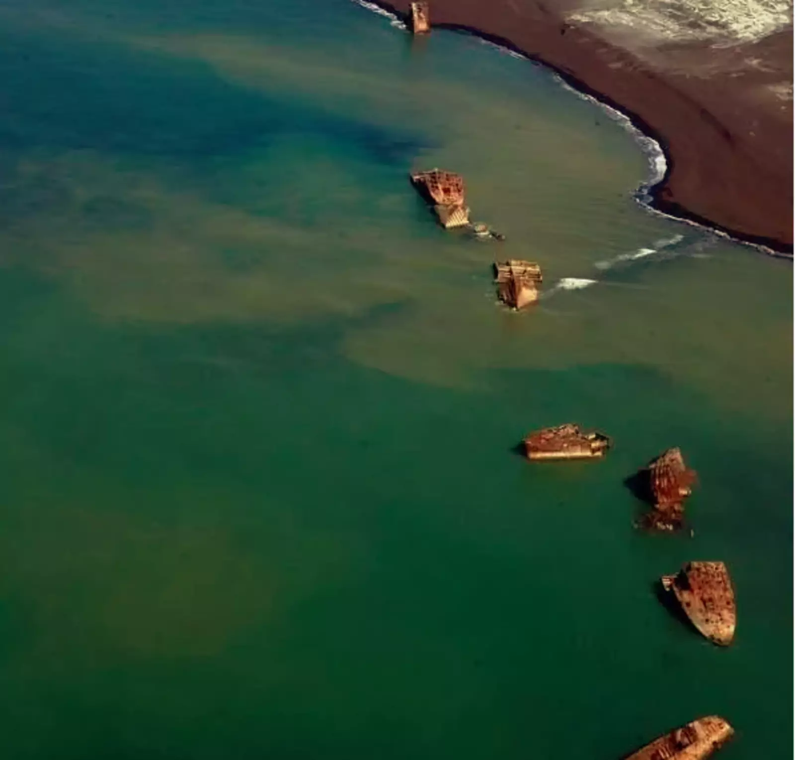Эти корабли захватили американские солдаты во время битвы за Иводзиму. Позже суда перегнали на западную часть острова и затопили их, чтобы использовать в качестве волнорезов для защиты других кораблей