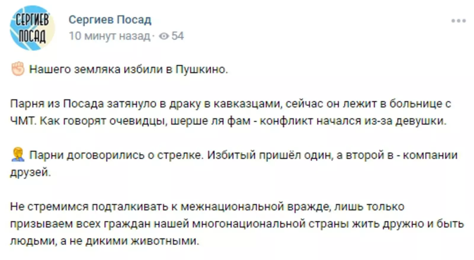 Сообщается, что избитый ногами подросток госпитализирован, он получил черепно-мозговую травму, а его лицо пришлось зашивать. В соцсетях утверждают, что пострадавший приехал на «стрелку» из Сергиева Посада. Есть версия, что он пришел на выяснение отношений один.