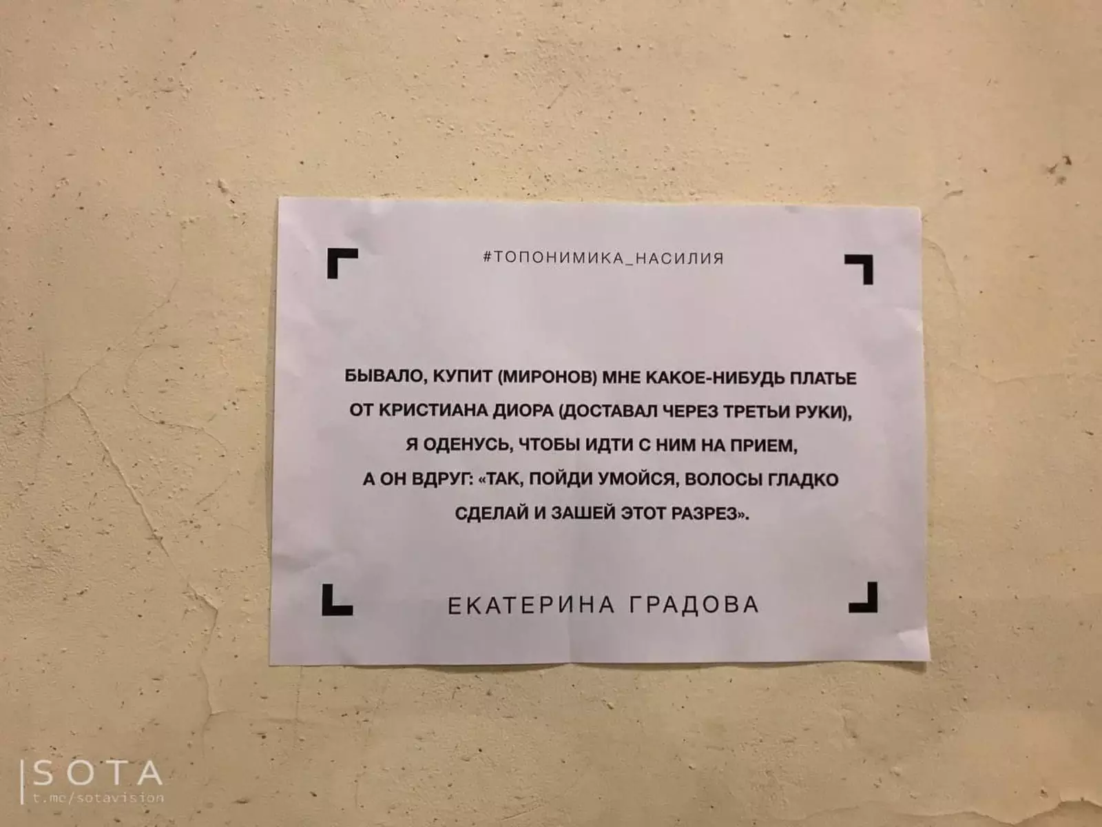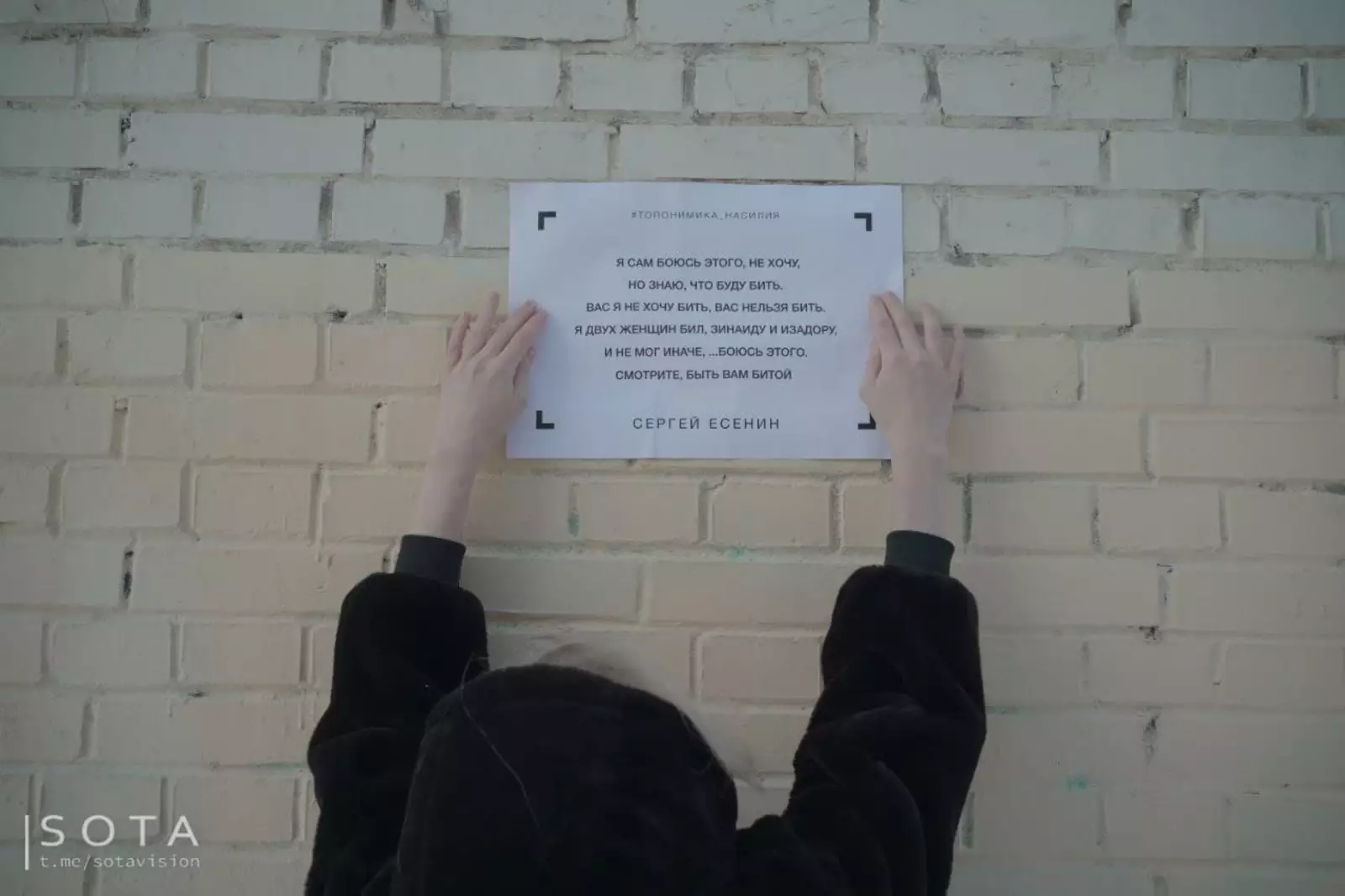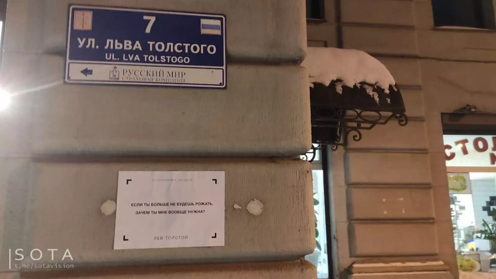 Активистки расклеили на стенах домов под табличками с адресами «улица Толстого», «улица Достоевского», «улица Некрасова и т. д.» цитаты из воспоминании современников, свидетельствующие об их недостаточно гуманном отношении к женам и возлюбленным.