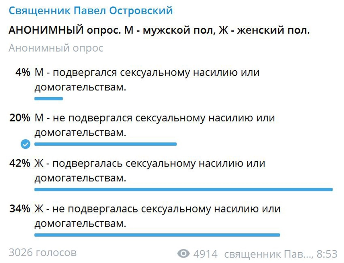 Бывший фанат ЦСКА, а ныне главная «звезда Рунета» из числа духовенства РПЦ иерей Павел Островский провел в своем Telegram-канале серию опросов о сексуальном насилии и домогательствах и оказался шокирован его результатами.
