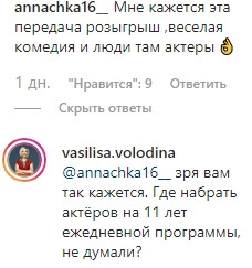 Слова Володиной подтвердила другая подписчица, которая рассказала, что она сама была участницей ток-шоу и при этом актрисой не является.