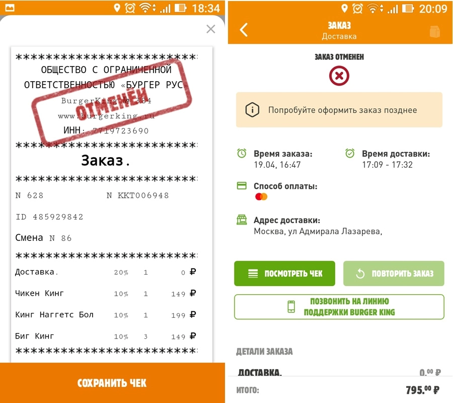 Пришлось снова звонить в «службу поддержки». Теперь уже мальчик, который оказался более полезен. Он спросил номер филиала «Бургер Кинг» и сумму заказа в чеке. Выяснил, что «ресторан» находится на улице Бартеневской, связался с ним и «нашел причину». Она оказалась проста: «слишком много заказов».