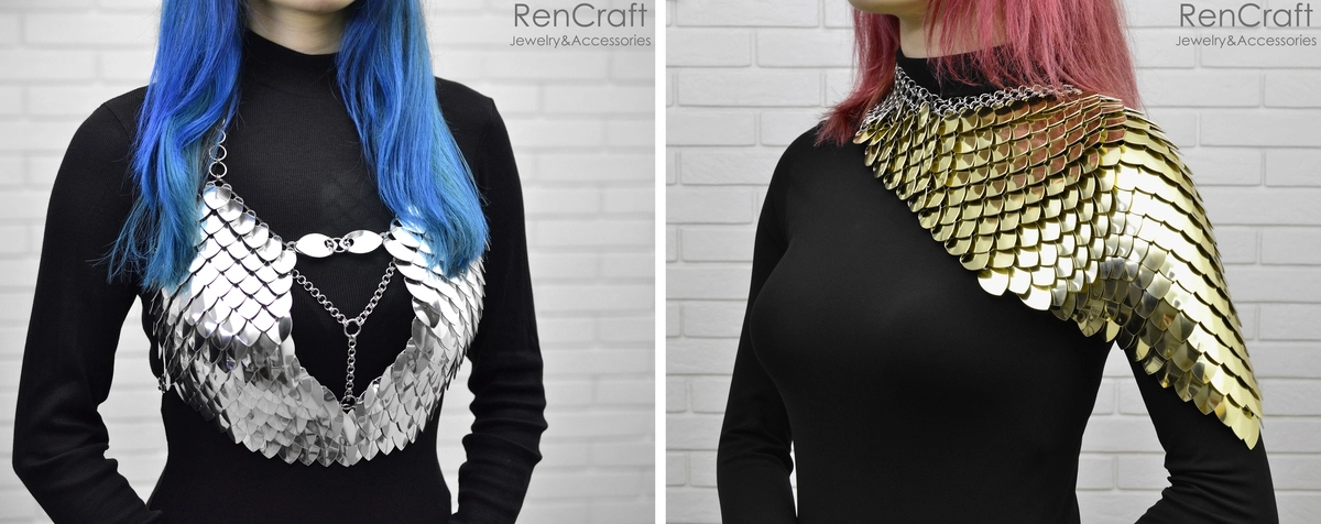 «Исключительно кольчужным плетением я занималась до 2018 года, когда натолкнулась в интернете на чешуйчатые аксессуары и меня очень заинтересовала техника «scalemaille». Я занялась подробным изучением вопросов изготовления украшений в этой технике и просмотрела огромное количество работ. «Scalemaille» является одним из подвидов кольчужного плетения, так как изделия создаются из чешуи и колец. Металлическая чешуя — универсальная вещь. Она подходит как для небольших украшений — колье, браслетов, серег, так и для крупных аксессуаров», — пояснила мастерица.