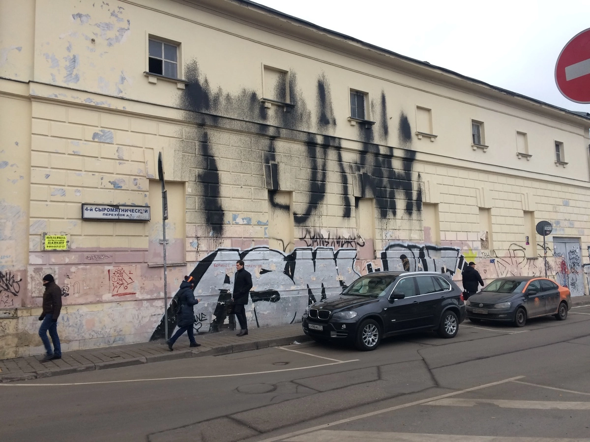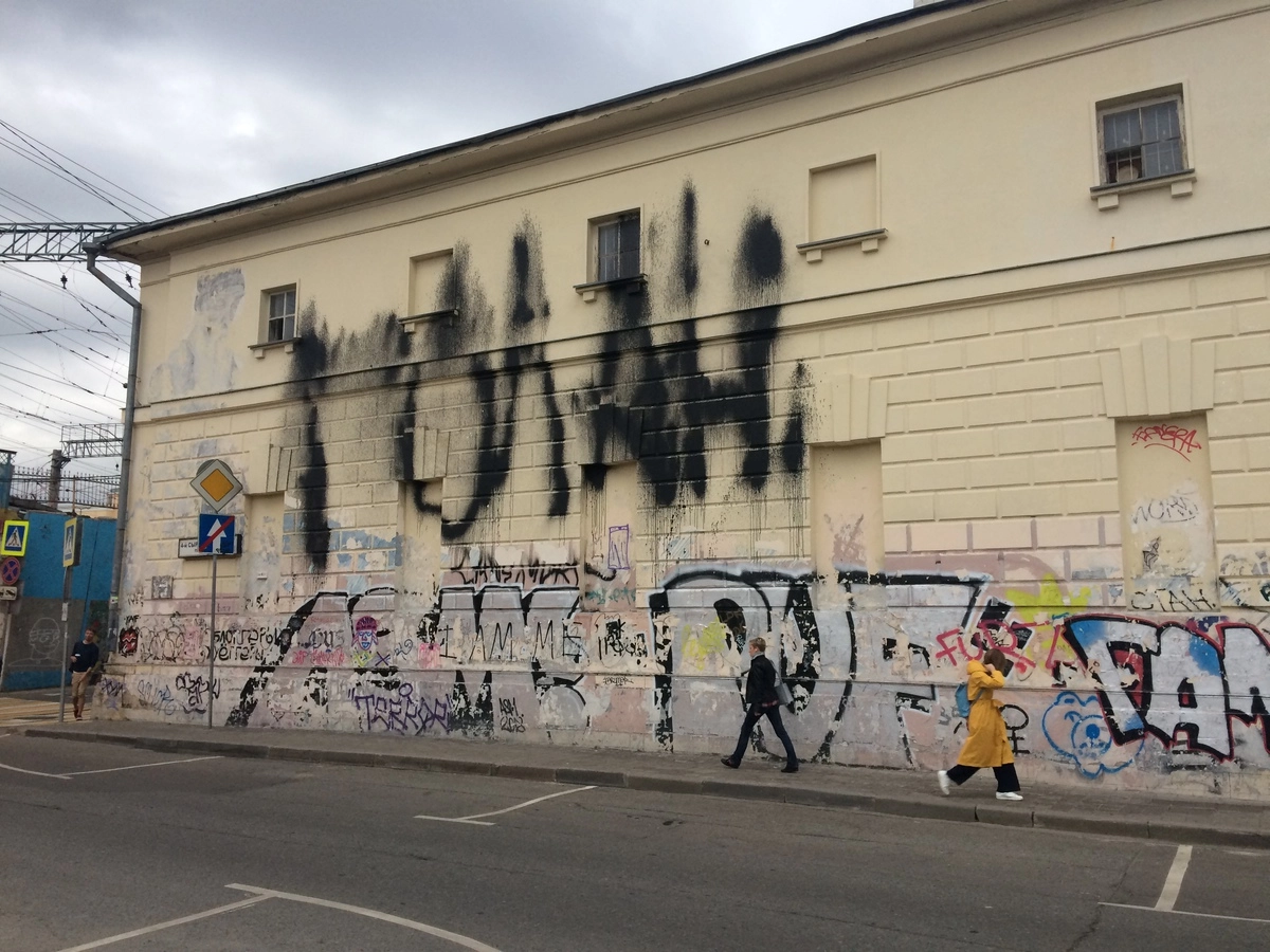 Надо отметить, что красивые граффити: портреты, пейзажи или просто что-то оригинальное на стенах серых зданий Москвы — это, я считаю, хорошее явление. Но когда какие-то люди от недалёкого ума рисуют кривые каракули и писаются от счастья в свои штаны в связи с этим, это вполне тянет на сигнал болезни, которую надо лечить принудительно в определённых местах.
