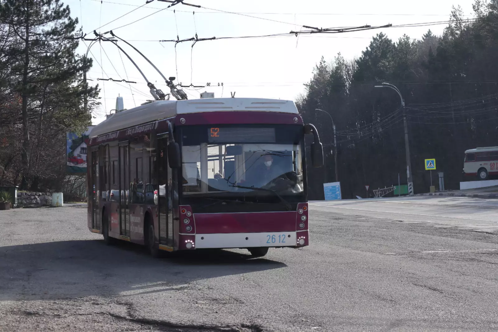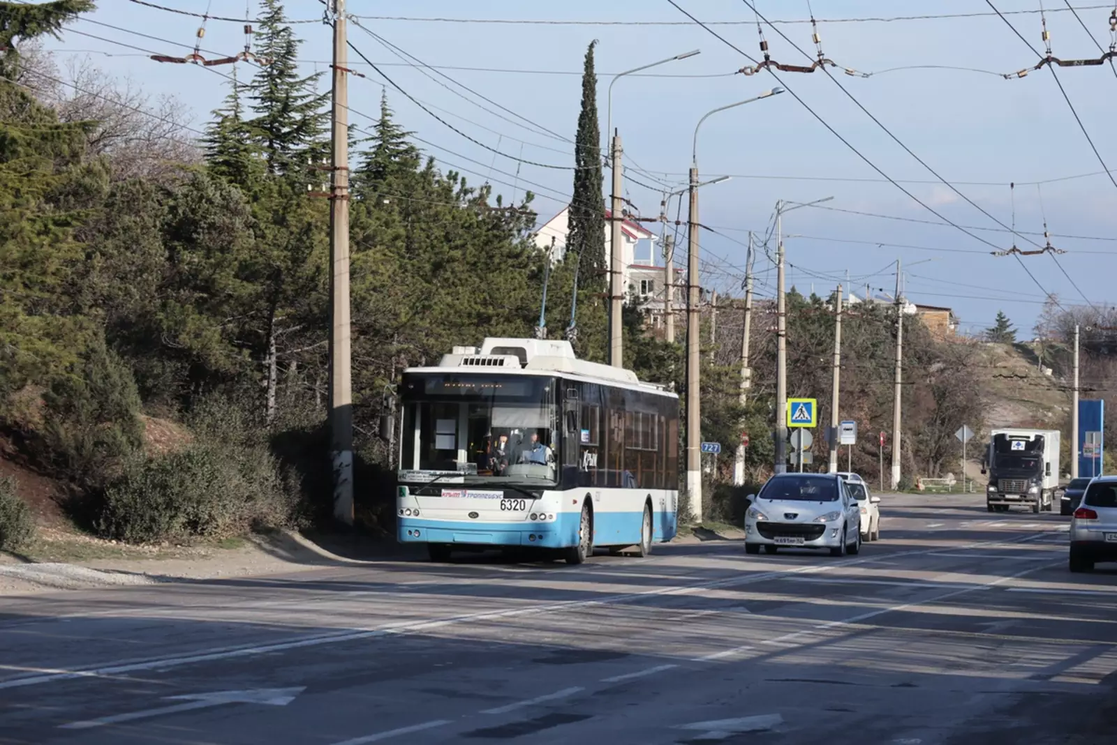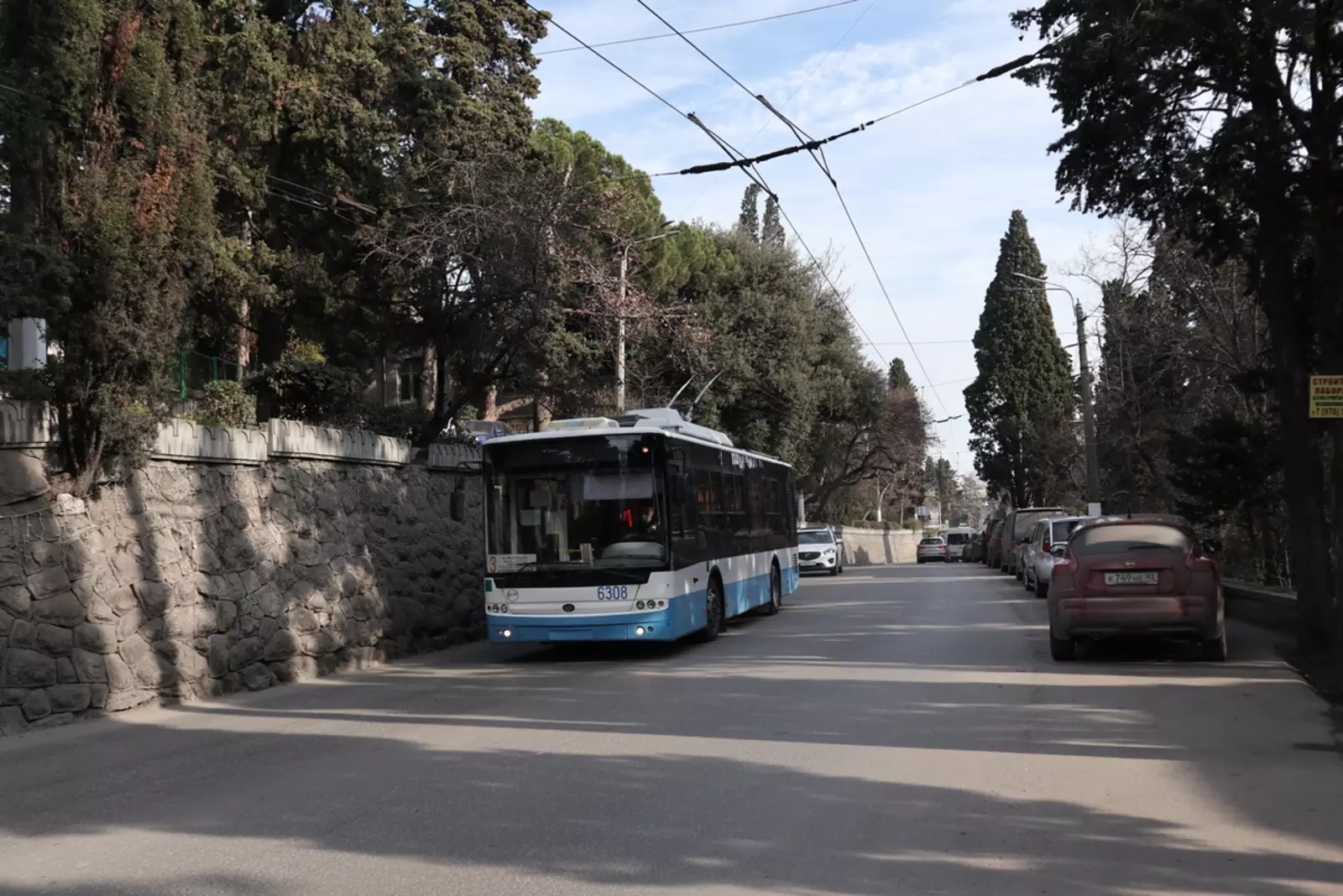 Есть ещё пригородные с обеих сторон. В Ялте это 42 до Никитского ботанического сада, а в Симферополе — 21 до Перевального. На нём встречаются вот такие трёхосные «Богданы».