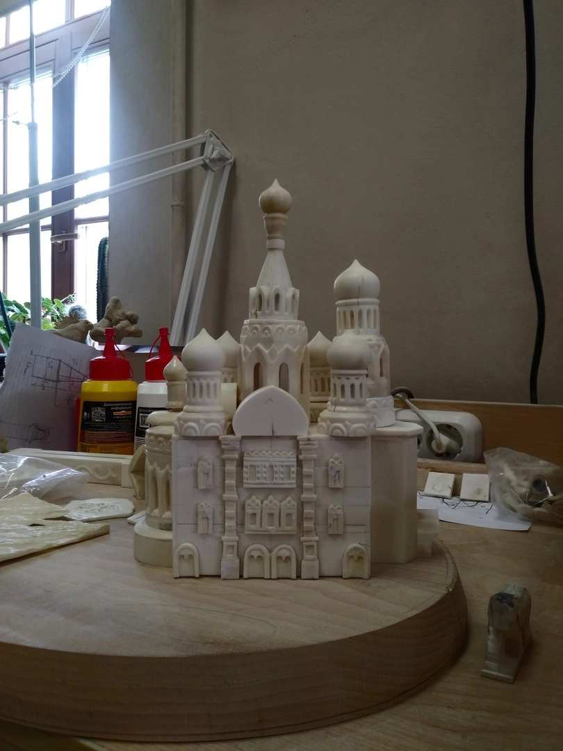 «Моей любимой работой является выпускная — „У Михайловского сада“, в рамках которой я изобразила храм Спас на крови. Я думаю, что это связано с тем, что она очень объемная и самая сложная по технике. Я очень долго вынашивала эту идею. На создание всей работы с храмом ушло около семи месяцев, если считать от начальных эскизов до конечного результата. Три месяца ушло на идею, а также на подготовку проекта. Изначально мне хотелось отдать дань уважения Санкт-Петербургу как городу, принявшему меня, и сделать работу посвященную ему. Выбрала именно архитектурную тематику, так как таких изделий из кости очень мало в России. В основном вдохновлялась западноевропейской резной костью 17−18 века. Но хотелось создать работу в стиле русских резчиков, в стиле холмогорской резьбы по кости».