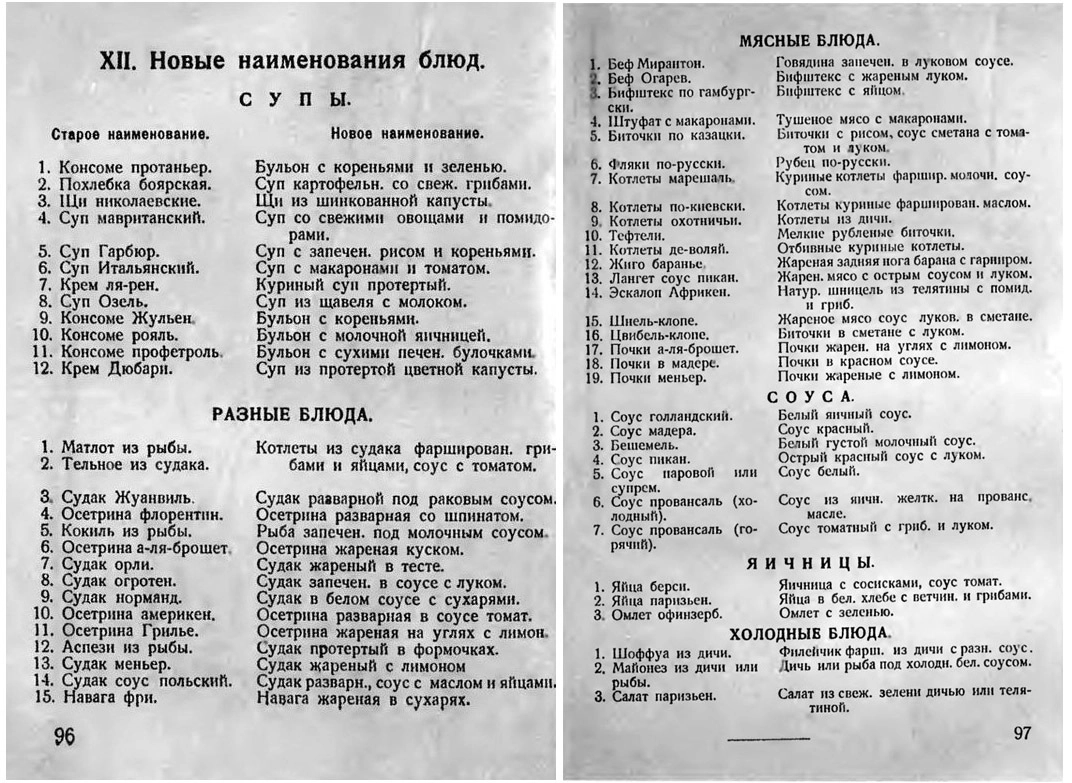 Так, «Похлёбка боярская» превратилась в «Суп картофельный со свежими грибами», «Щи николаевские» стали «Щами из шинкованной капусты», а «Судак с польским соусом» превратился в «Судака разварного, соус с маслом и яйцами».