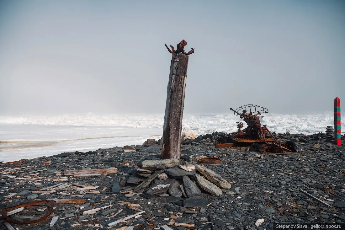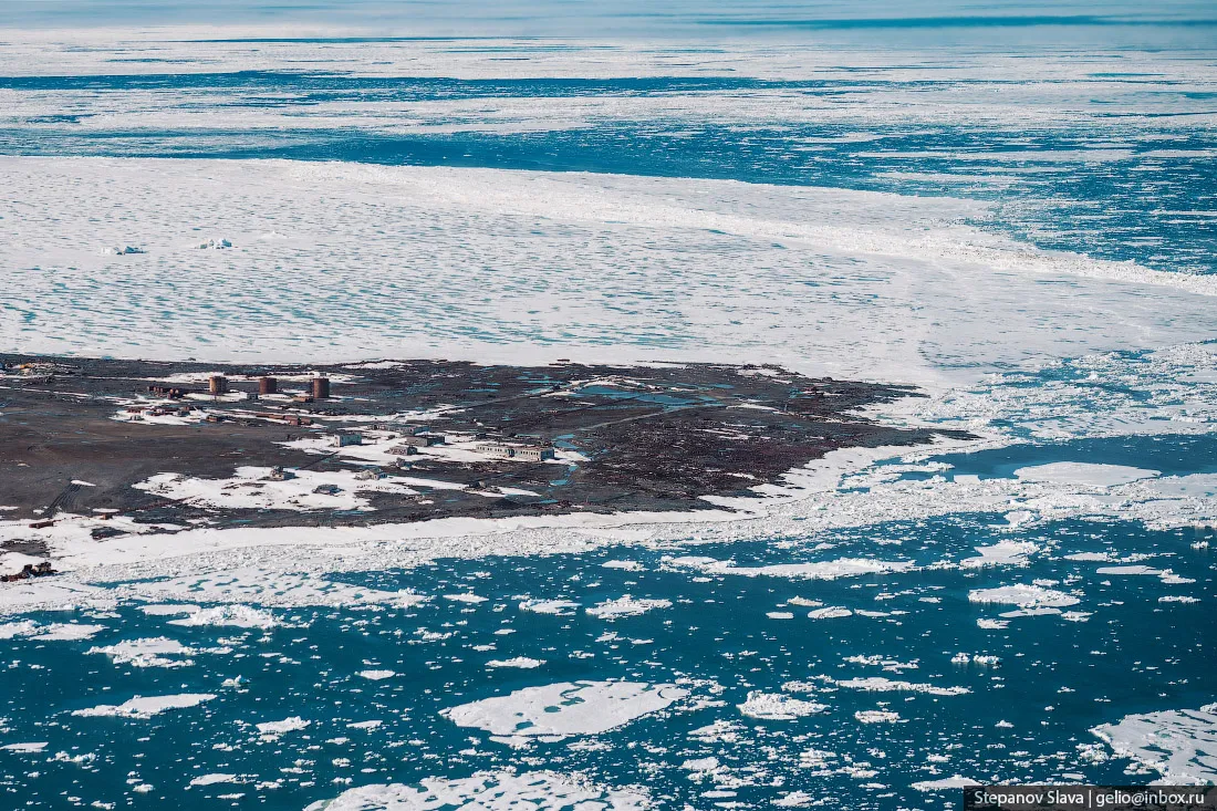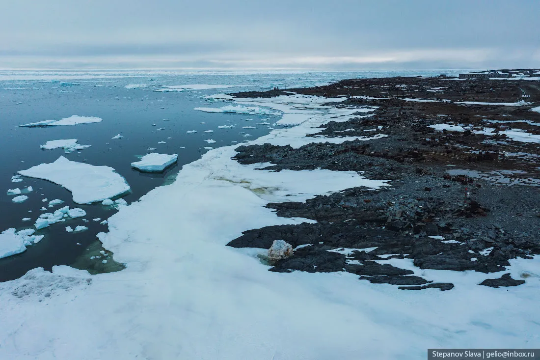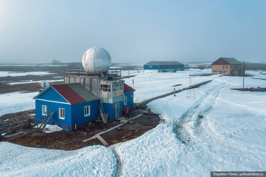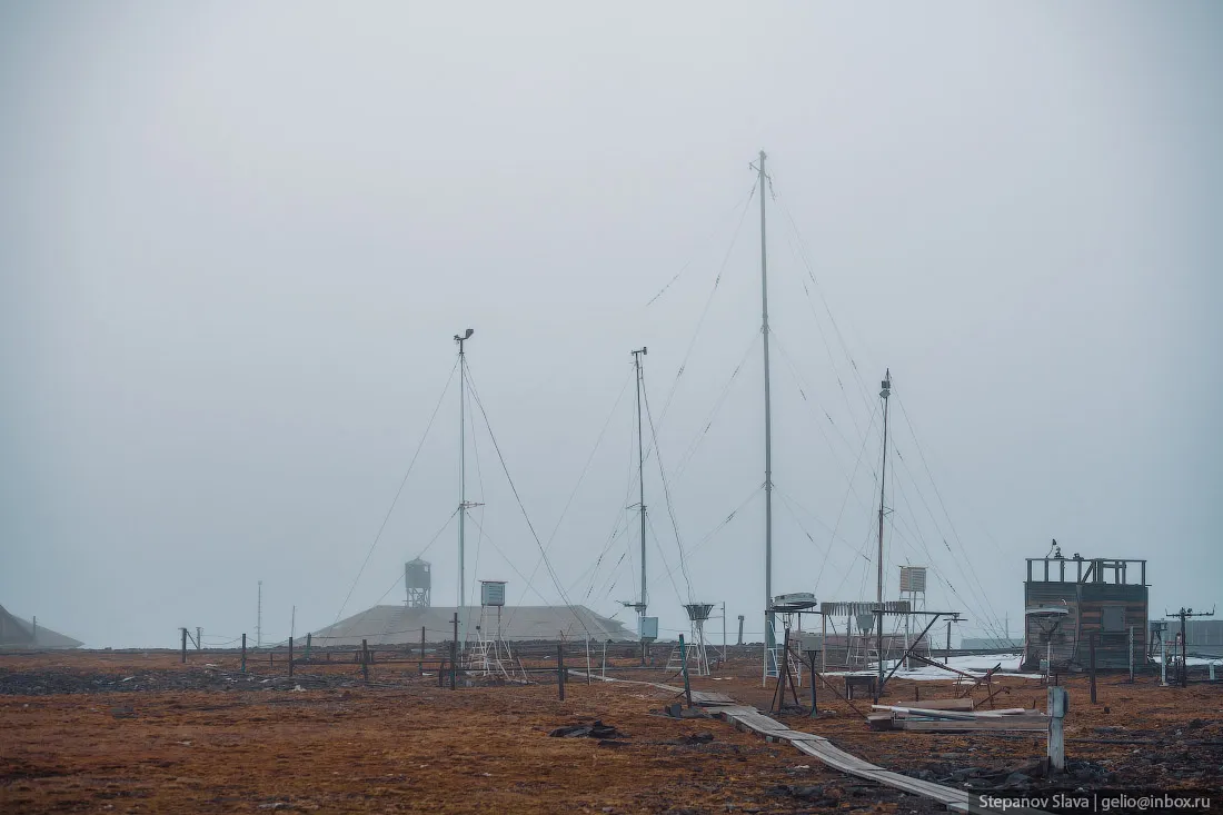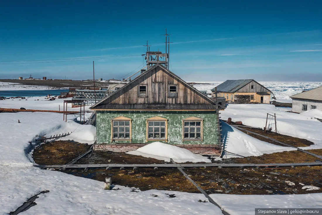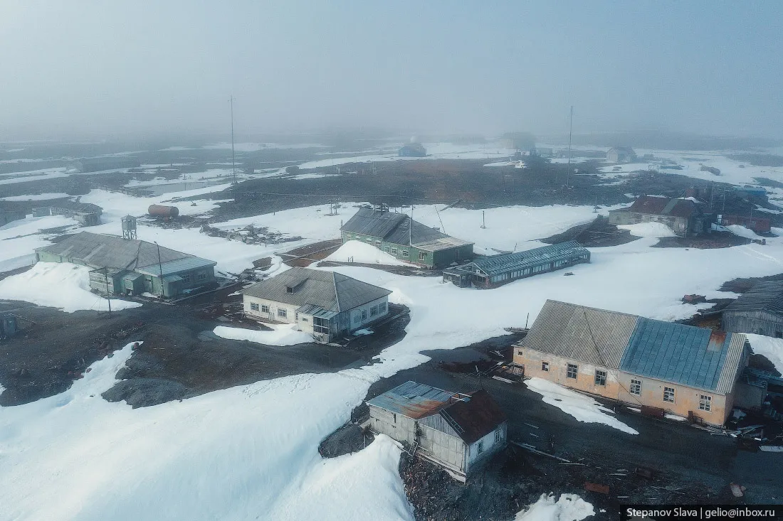 49. Раньше здесь был жилой посёлок со своей администрацией, медпунктом, почтой, детским садом. На берегу была взлётно-посадочная полоса, раз в неделю прилетал самолёт. Сейчас все снабжение происходит один раз в год — к мысу подходит ледокол «Михаил Сомов», который доставляет продукты, оборудование, топливо, привозит на станцию новую смену полярников.