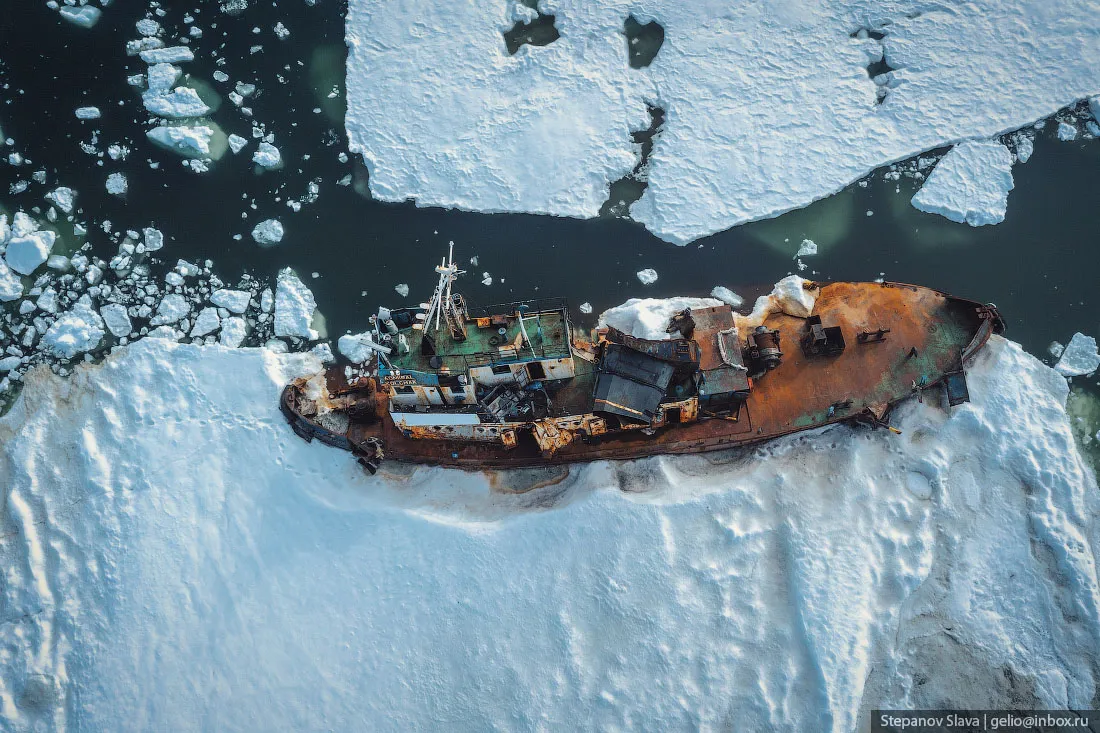45. Севший на мель теплоход Адмирал Колчак. Этот буксир доставлял на мыс баржу со строительными материалами и техникой, которые были нужны для погранзаставы. Но судно было не предназначено для работы в таких широтах — начался шторм и теплоход выбросило на берег. Произошло всё в 2020 году.