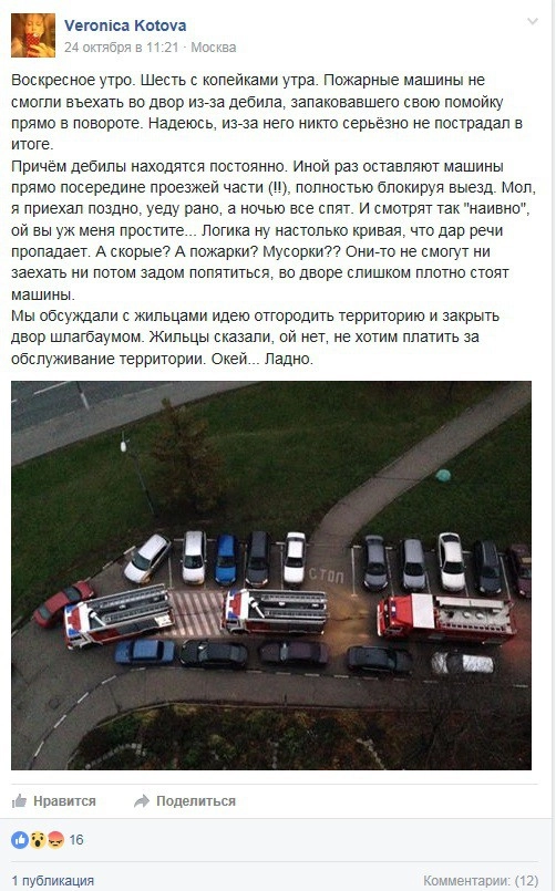 Причём дебилы находятся постоянно. Иной раз оставляют машины прямо посередине проезжей части, полностью блокируя выезд. Мол, я приехал поздно, уеду рано, а ночью все спят. И смотрят так „наивно“, ой вы уж меня простите… Логика ну настолько кривая, что дар речи пропадает. А скорые? А пожарки? Мусорки? Они-то не смогут ни заехать ни потом задом попятиться, во дворе слишком плотно стоят машины. Мы обсуждали с жильцами идею отгородить территорию и закрыть двор шлагбаумом. Жильцы сказали, ой нет, не хотим платить за обслуживание территории. Окей… Ладно», выражает негодование автохамами Вероника Котова, жительница района Ясенево в своем посте в социальной сети Фейсбук.
