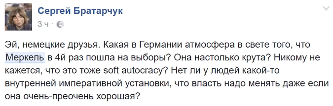 «Как и любой другой политик, Меркель настроена на то, чтобы оставаться у власти как можно дольше, — отметил в беседе с „Ридусом“ политический аналитик международной мониторинговой организации CIS-EMO Станислав Бышок. — Если немцы хотят видеть продолжение политики открытых дверей, приема экономических мигрантов, которых, почему-то, называют „беженцами“, если хотят продолжения совершенно ненужной германской экономике противостояния с России — вольному воля».