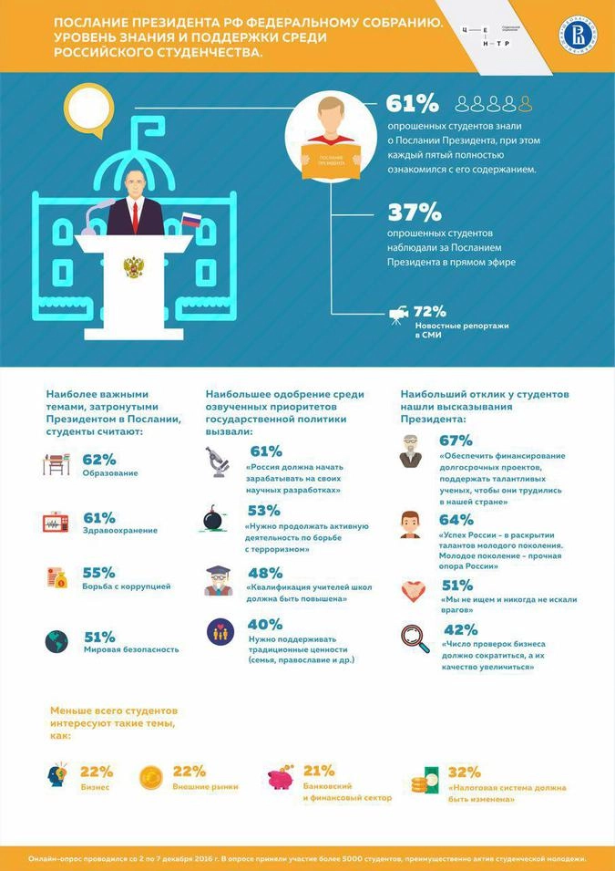 По данным Центра студенческой социологии, около 61% опрошенных знали о послании Владимира Путина, однако полностью с его содержанием ознакомился лишь каждый пятый респондент, а частично — каждый второй.