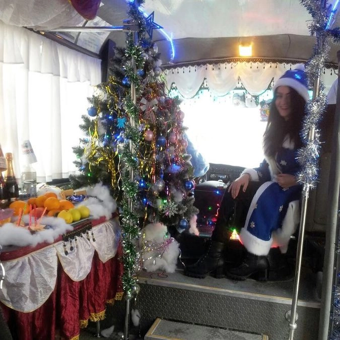 Салатов и горячих закусок на столе нет, как и спиртного. Зато есть сладости, фрукты, газированные напитки и детское шампанское. Сам водитель наряжается в костюм Деда Мороза, а в этом году у него в напарниках появилась кондукторша Снегурочка. Для поддержания праздничного настроения в салоне играет новогодняя музыка.