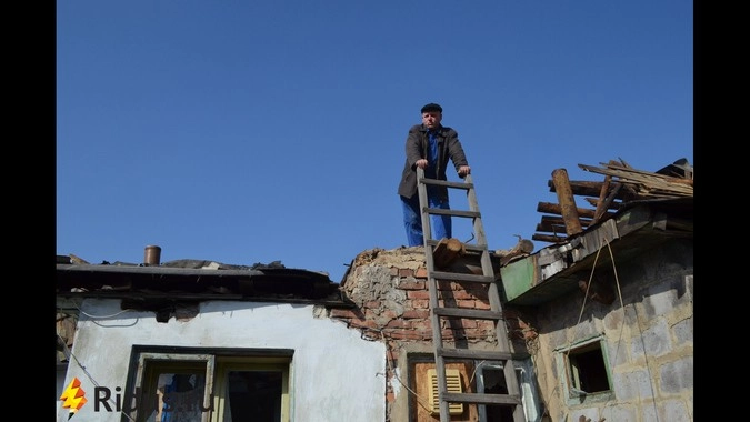 Этой ночью стреляли по всему Донецку. Трудовские — запад, а следующий адрес — на севере, в Киевском районе. Мина проломила крышу частного дома. Хозяйка не хочет сниматься, ей не до того. Зато не прочь поговорить мужчины, помогающие ей.