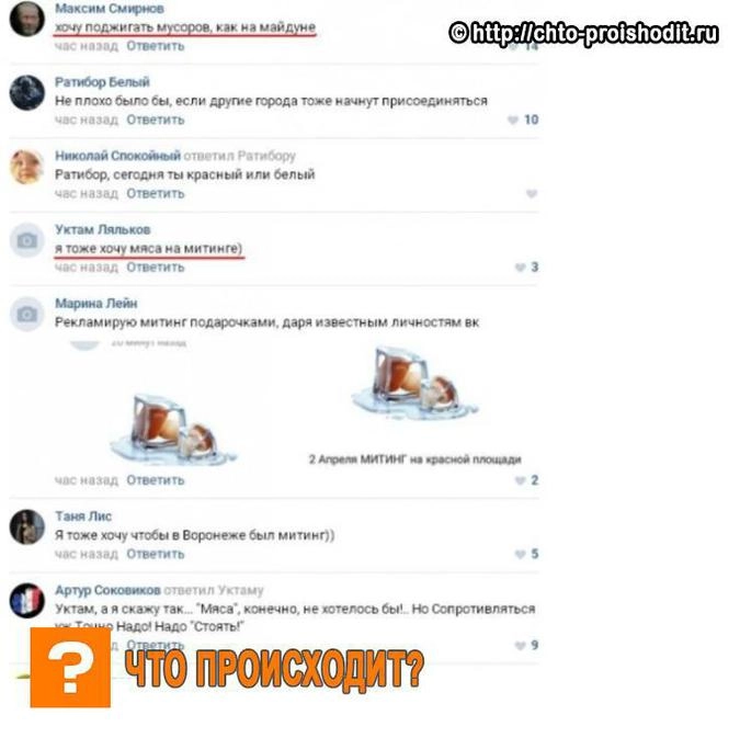 Организатор одного из таких сообществ в социальной сети «ВКонтакте» призывал всех «неравнодушных граждан» выйти 2 апреля к московскому Кремлю и устроить очередной незаконный митинг против российской власти, используя в том числе и повестку главы Фонда борьбы с коррупцией Алексея Навального. При этом соратники Навального отрицают свою причастность к запланированной акции.