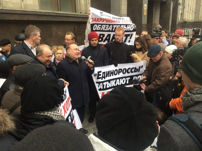 Импровизированный «сход несогласных» у входа в здание нижней палаты парламента формально был посвящен обсуждению законопроекта о приравнивании любых встреч депутатов с людьми к митингам. Впрочем, звучали и призывы устроить проверку данных Фонда борьбы с коррупцией о якобы имеющихся незадекларированных активах у премьер-министра Дмитрия Медведева.