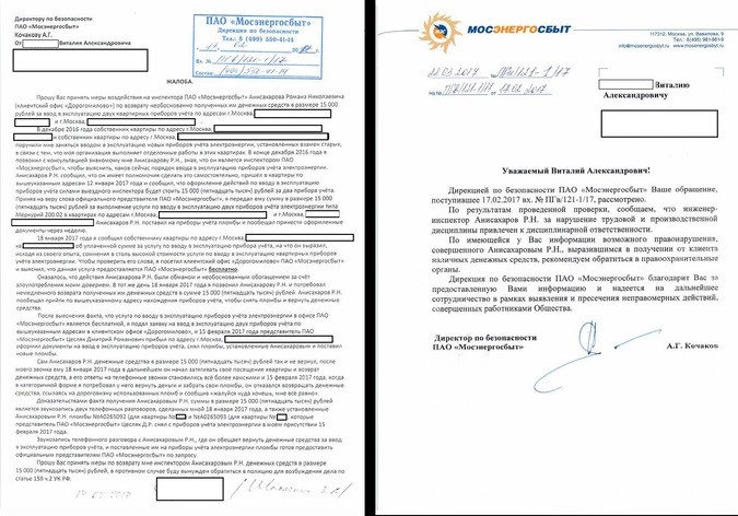 Обманутые клиенты компании обратились в «Мосэнергосбыт» с жалобой на действия инспектора Романа Анисахарова и получили спустя полтора месяца от дирекции по безопасности ПАО «Мосэнергосбыт» ответ (копии документов имеются в редакции. — Прим. ред.):