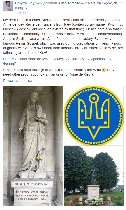 Он добавил, что Реймское Евангелие, о котором шла речь, изначально принадлежало самой Анне, — его она получила от своего отца. Также Шимкив прикрепил к записи изображение герба Ярослава Мудрого, похожего на тризуб. «Вам нужны ещё доказательства об украинском происхождении Анны де Киев?» — спросил он.