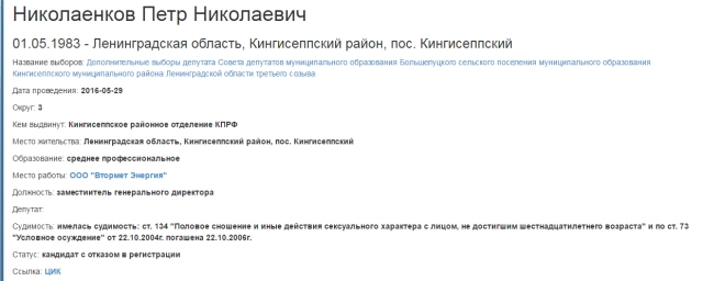 Ранее выяснилось, что организатором акции 12 июня в Кингисеппе Ленинградской области стал 34-летний Петр Николаенков, который в 2004 году был осужден условно по статье «Половое сношение и иные действия сексуального характера с лицом, не достигшим 16-летнего возраста».