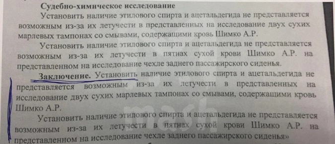 Позднее появилось заключение экспертов, согласно которому в крови мальчика было 2,7 промилле алкоголя. По словам экспертов, это очень высокая доза для ребенка. Родители Алеши Шимко были шокированы результатами экспертизы. Они потребовали вновь взять образцы крови, например с капота автомобиля, и провести повторный анализ.