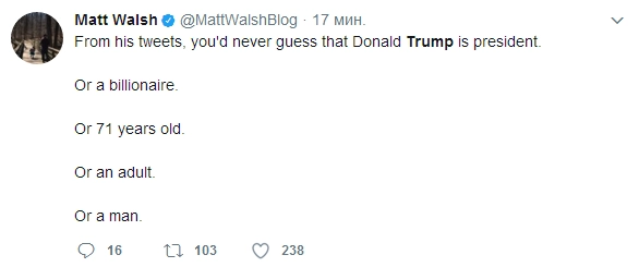 Публикация вызвала у пользователей Сети негативную реакцию. «Из его твитов вы никогда не догадаетесь, что Дональд Трамп — президент. Или миллиардер. Или — что ему 71 год. Или взрослый. Или мужчина», — высказался один из блогеров.