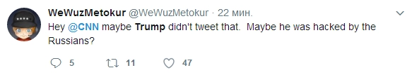 «А где-то ребенок с квадратной маленькой головой СNN переживает, что Трамп избил его отца», «Эй, CNN, может быть, Трамп не писал этого? Может быть, он был взломан российскими хакерами», — шутят пользователи.