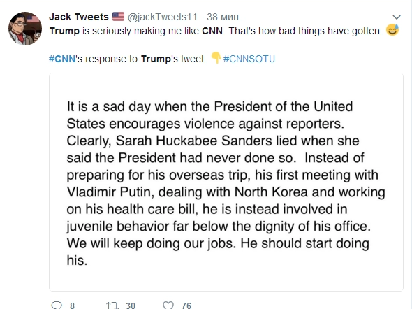 По Сети моментально разлетелся ответ CNN. «Это грустный день, когда президент Соединенных Штатов поощряет насилие в отношении журналистов… Мы будем продолжать делать свою работу. Он должен начать делать свою».