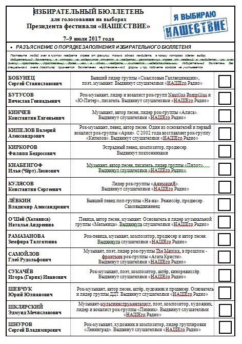 Специальный бюллетень для выборов президента «Нашествия», подготовленный ЦИК РФ, представлен публике. В списке кандидатов на пост главы рок-фестиваля — 15 артистов: наряду с Сергеем Шнуровым, Валерием Кипеловым, Юрием Шевчуком и другими рокерами в предвыборной гонке участвуют эстрадный певец Филипп Киркоров и экс-«нанаец» Владимир Левкин.