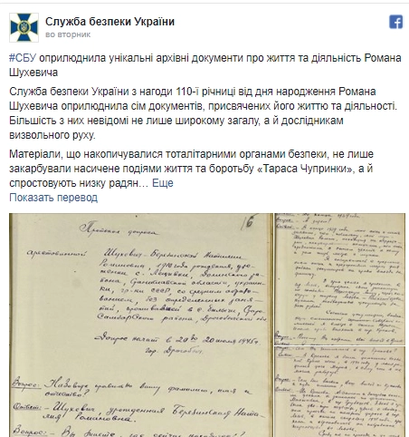Служба безопасности Украины опубликовала на своей странице в Facebook ряд документов из архивов КГБ СССР, касающихся жизни командира Украинской повстанческой армией (УПА — запрещенная в России организация) Романа Шухевича.